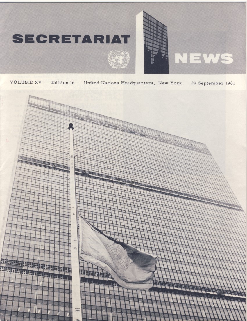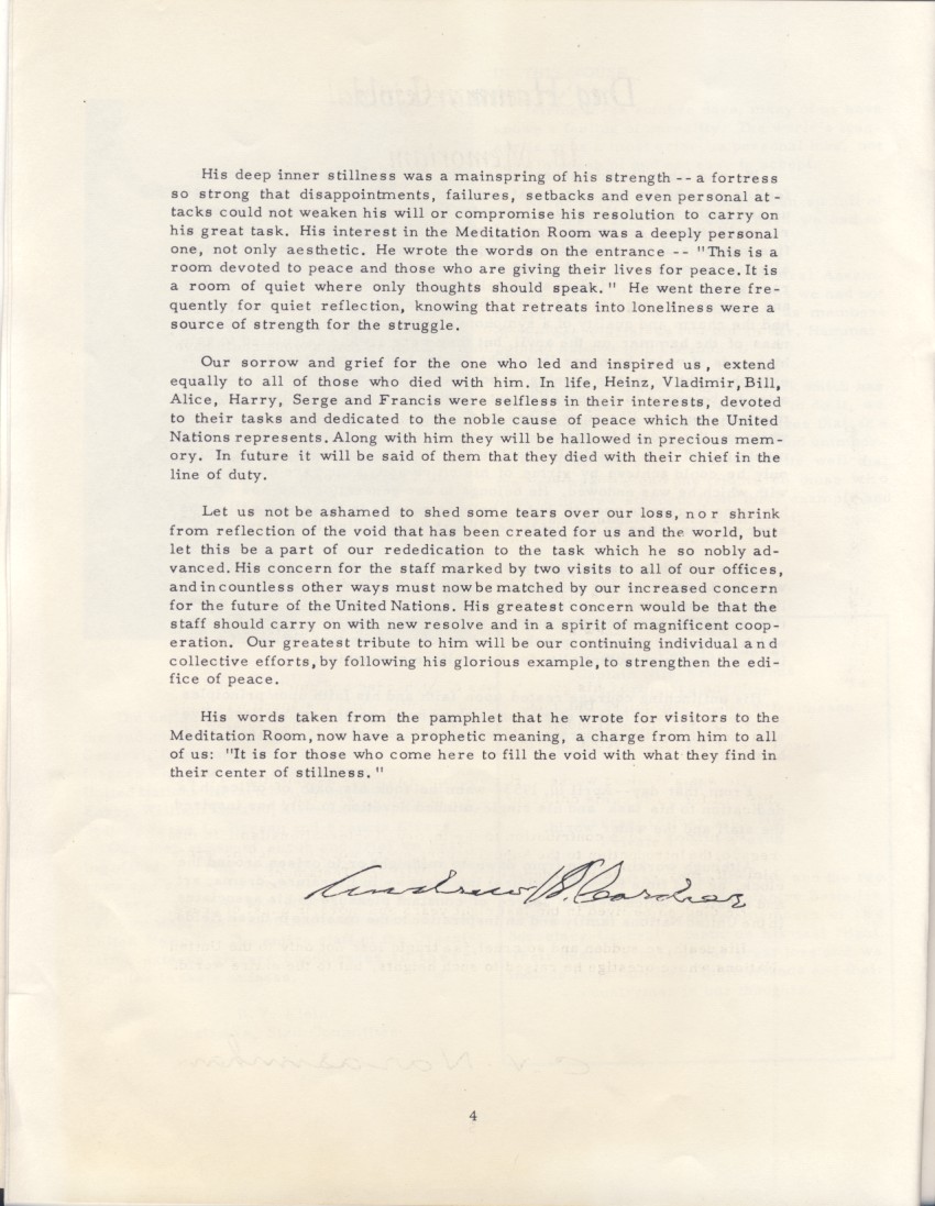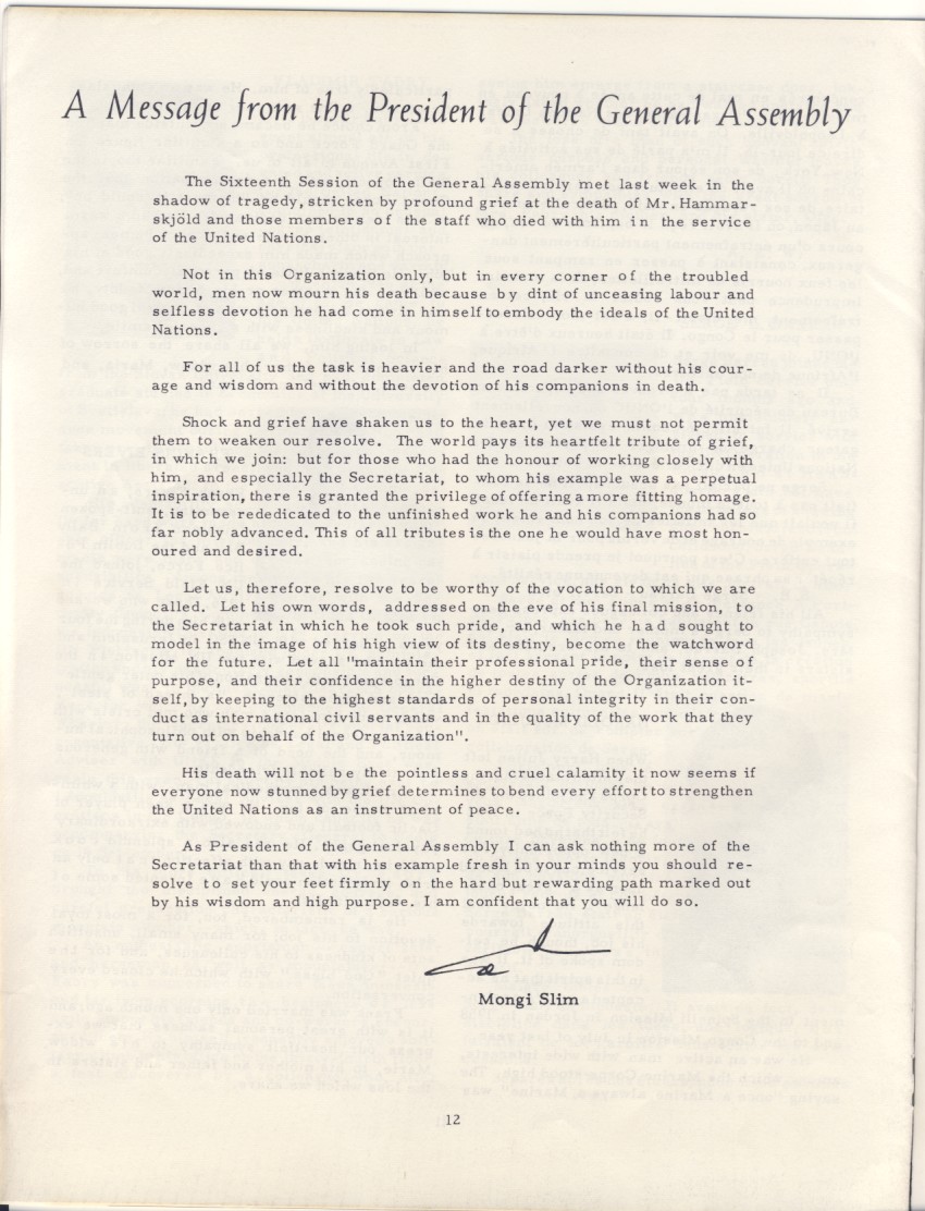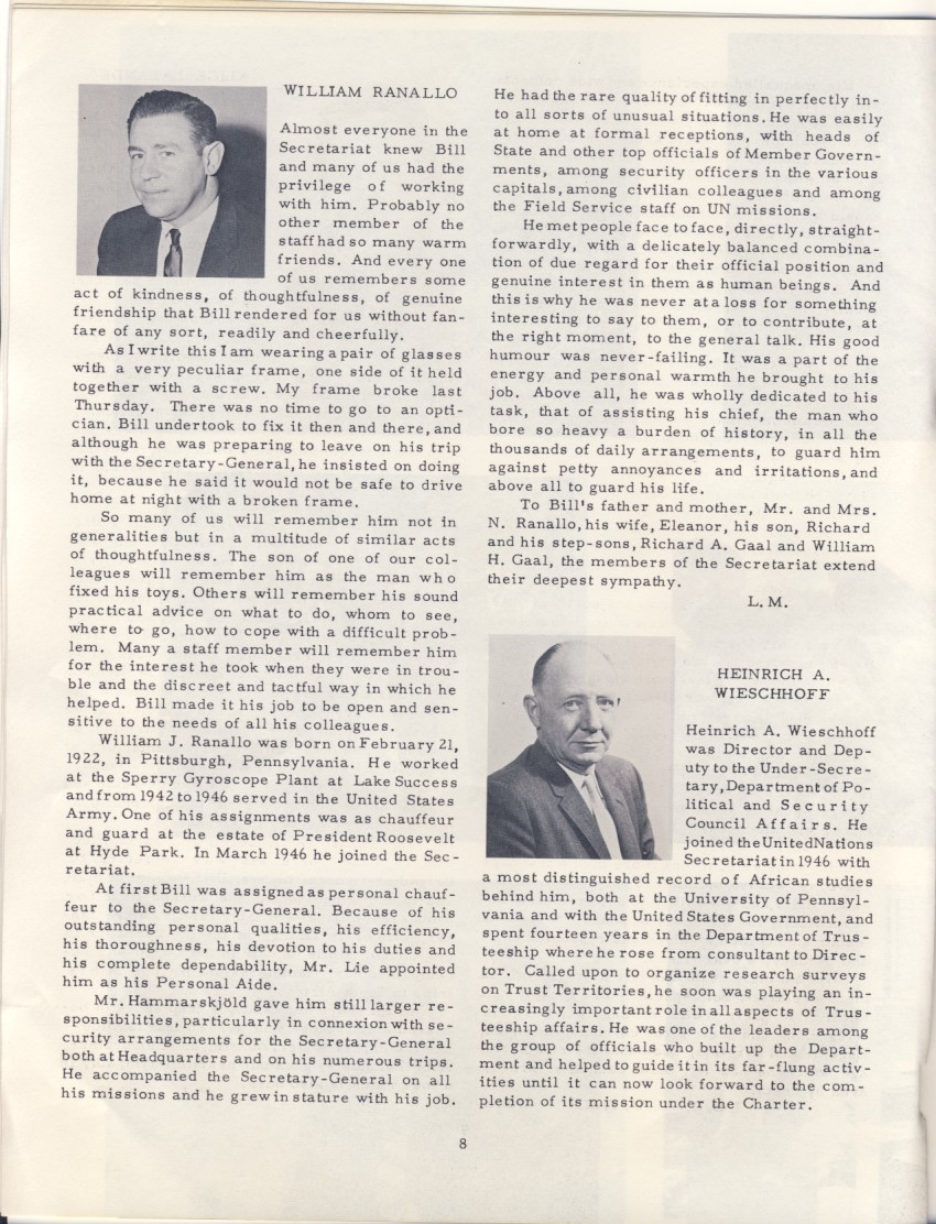 The entire staff of the United Nations mourns the sudden and tragic death of the Secretary-General, Dag Hammarskjold, and our other colleagues who lost their lives in the service of the United Nations: Heinrich A. Wieschhoff, Vladimir Fabry, William Ranallo, Alice Lalande, Harold M. Julien, Serge L. Barrau and Francis Eivers.