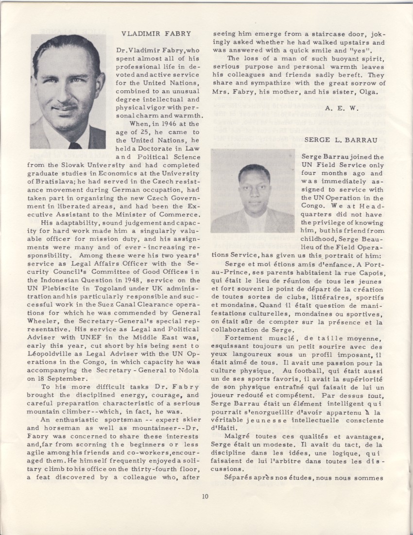 Serge Barrau joined the UN Field Service only four months ago and was immediately assigned to service with the UN Operation in the Congo. We at Headquarters did not have the privilege of knowing him, but his friend from childhood, Serge Beaulieu of the Field Operations Service, has given us this portrait of him: