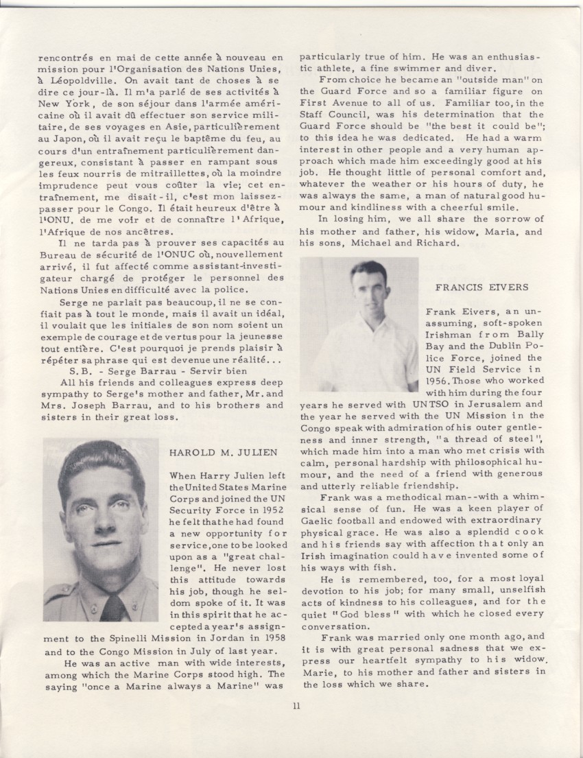 When Harry Julien left the United States Marine Corps and joined the UN Security Force in 1952 he felt that he had found a new opportunity for service, one to be looked upon as a “great challenge”. He never lost this attitude towards his job, though he seldom spoke of it. It was in this spirit that he accepted a years’ assignment to the Spinelli Mission in Jordan in 1958 and to the Congo Mission in July of last year.