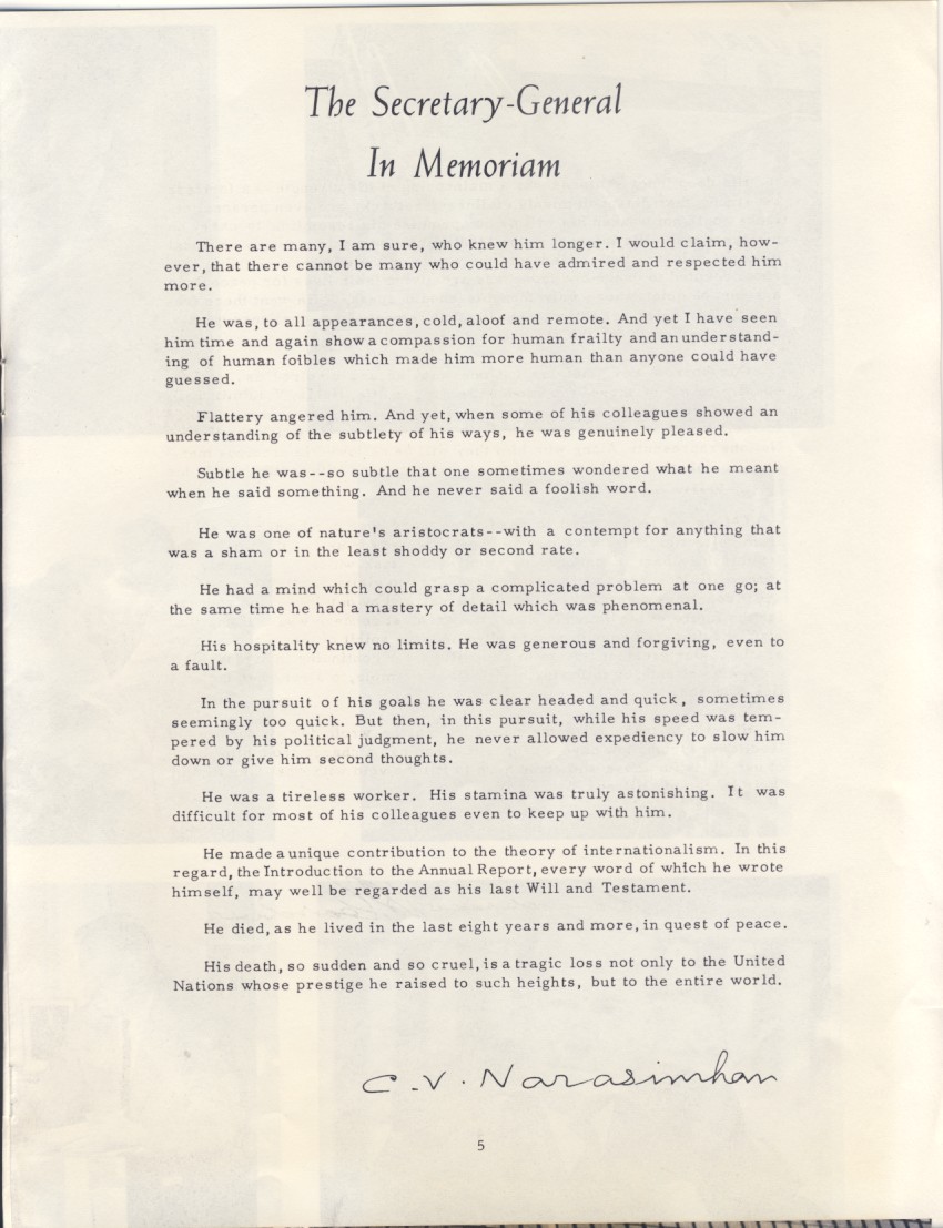 We who labor “in this house” share with the whole of humanity the deep feeling of unbelief that our great and esteemed chief has been lost to us and to the world. He served humanity in the noble mission of peace and reconciliation as Secretary-General of the United Nations for eight years, five months and one week. His passing marks the close of an era of unparalleled richness — in the charting of new paths in diplomacy, in combining rare gifts of energy, wisdom and intelligence to bring crises under control and to promote programs for human betterment. Sometimes his methods had the charm and quality of a symphony; sometimes the decisive abruptness of the hammer on the anvil, but they were always calculated to gain high ends of which he never lost sight. If he had accomplished less, his epitaph might be that in opening up bold new vistas of international cooperation he belonged to a generation yet unborn. But his accomplishments are myriad–they are like snowflakes on a dotted landscape and the glistening white on the mountain peaks–countless small almost unnoticed achievements joined with decisively constructive results on great issues which only he could achieve by virtue of his office and of the rare natural gifts with which he was endowed. He belongs to our generation; he has carved his name in granite upon it; but he belongs equally to those who will come after us, benefiting by the lights he lit that can illumine their way.
