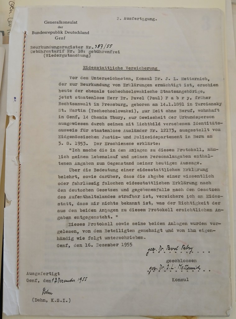 With great respect to Army General Lev Prchala and to our grandfather Dr. Pavel Fabry – Czechoslovakian heroes, defenders of democratic freedom, symbols of resistance against nazis and fascists! These are the last letters between them, from 1960, with related documents included. Translations will be added later. Pavel died of a heart attack in Berlin on 19 December 1960, he was 69. Vlado took over the remaining legal work from his father, somehow finding time for it while also working for the UN in the Congo. Vlado’s letter to the General is sent from Hotel Le Royal, Leopoldville (now Kinshasa), 12 March 1961. It brings tears to my eyes how much love they had for their friends, the personal sacrifices they were willing to make for each other – my cup runs over in their memory.