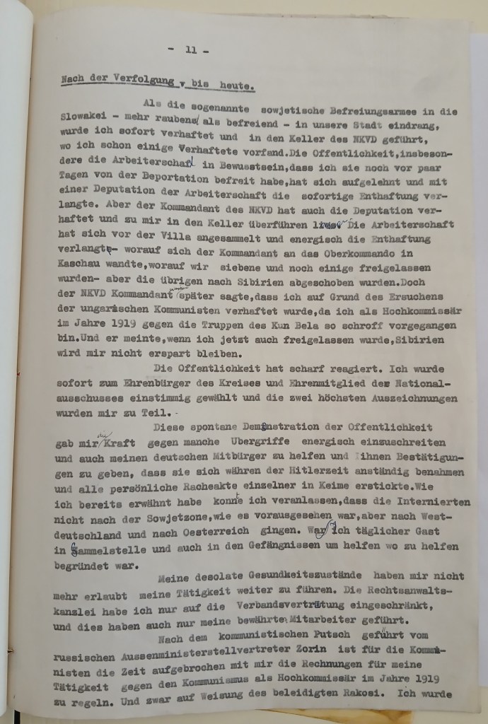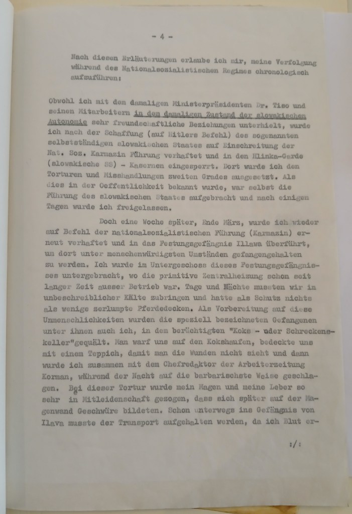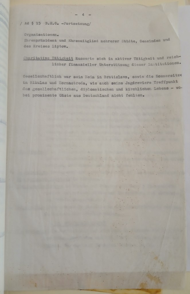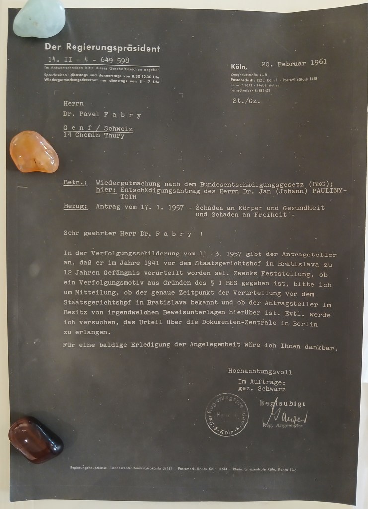 potvrzuji s díky Váš ctěný dopis z 23.7.60 a sice teprve dnes, poněvadž jsem čekal, že se Kolín ozve. Bohužel se tak dosud nestalo. Mezitím jsem obdržel dopis od p. ministra Seebohma, jenž mi sděluje, že i jemu bylo A Amtem potvrzeno, že stanovisko AA bylo příznivé a odesláno Regierungspräsidentovi v Kolíně. Po obdržení této odpovědi A-amt spojil se ministr S. S panem Dr. Mirgelerem a žádal jej, aby moje věc byla uspíšena. M. mu to slíbil, ale podotkl, že Kolín se mne ještě jednou dotáže a požádá potvrzení, cituji: „der Staatenhorigkeit, die früher als 1956 vorhanden sein müsste, aber danach mit einer boldigen Entscheidung gerechnet werden könne“. Teď ale už tomu vůbec nerozumím. Vždyť v mé žádosti o rentu podle § 1 BEG výslovně stojí, kdo jsem a co jsem a také to že jsem od roku 1939 staatenlos.