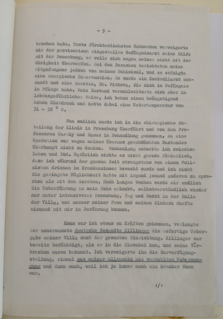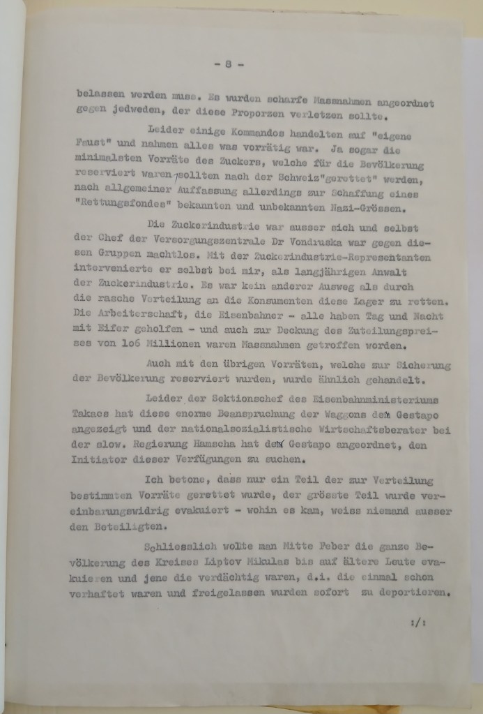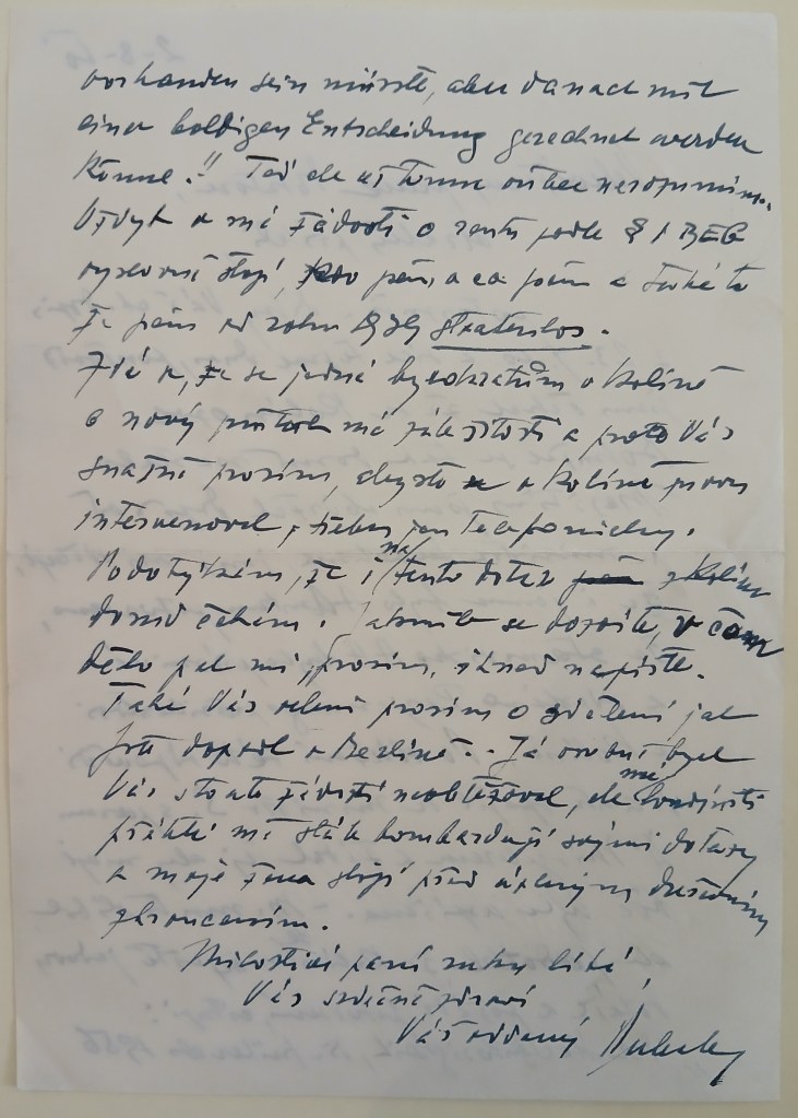 Mě osobně velmi znepokojuje mlčení Kolína. Nedostal jsem dosud ani „Erklärung“, který jsem měl podepsat, ani povolání k lékařské prohlídce. Höniger sice slíbil, že po své dovolené, která končila 6.9., zajede do Kolína a o mé věci osobně pohovoří s Reg. Presidentem, ale dosud jsem bez zprávy jak z Kolína tak od Hönigera. A proto Vás prosím, abyste Vy se na to ještě jednou podíval, a to proto, poněvad6 Vám věří a vím, že bez Vaší intervence se nic nevyřídí.