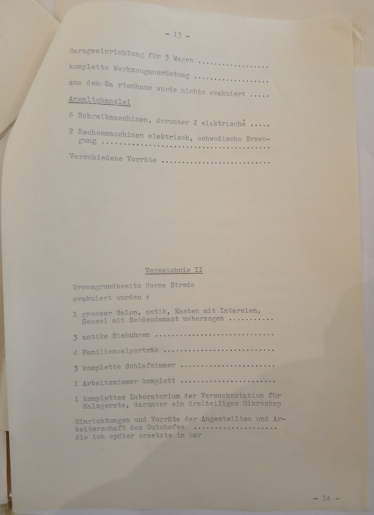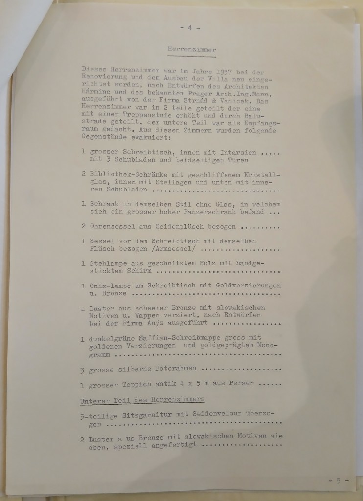 sedím stále v Rienecku a čekám na Vaše zavolání. Mám zde již dlouhou chvíli a rád bych se již zas vrátil do Londýna, kde mě žena netrpělivě očekává. Píše mi zoufalé dopisy, poněvadž je nemocná a potřebuje důkladné lékařské vyšetření a léčení, které je v Londýně dosti drahé, když se tomu podrobujete u privátního lékaře a ne na health service, které je zdlouhavé a dosti povrchní. Chudinka nechápe, že zde nelze věci uspíšit více než to děláme a že je třeba míti velikou trpělivost. Doufám, že jste v Kolíně dobře pořídil a že i s našimi záležitostmi se dostaneme o krok dále a to dříve než pánové půjdou opět na svou dovolenou. Očekávám toužebně Vaši laskavou odpověď a jsem s ruky políbením milostivé paní, mému strážnému anděli, a se srdečnými pozdravy Vám, velevážený,