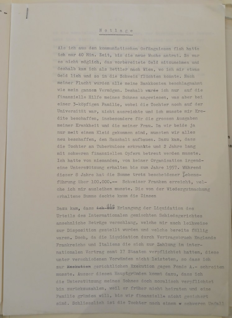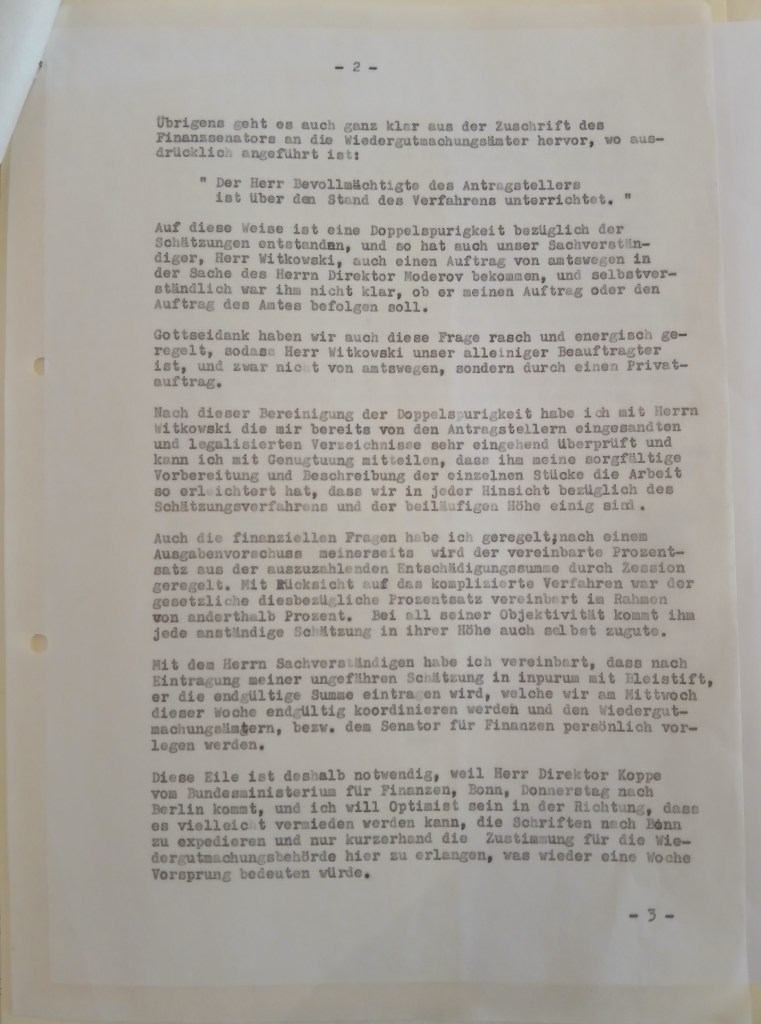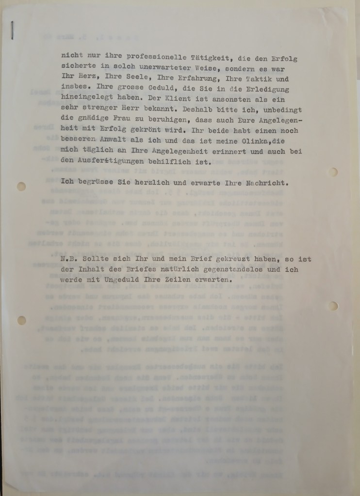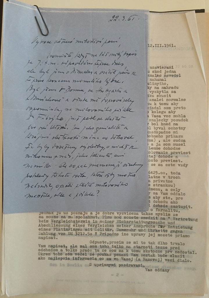 Thank you very much for your esteemed letter of 12.3.61, which I received only on the 20th of this month, just after sending my letter to Mrs. Tagova. She sent me the letter on 7.3.61, while I was in Germany, and asked me only for a short statement that I agreed with the expert’s estimate of 6,425DM. I sent this to her immediately after my return, i.e. on the 20th of this month, with my notarized signature. She did not ask for a power of attorney from me, because she hopes that it will be possible to do without a “Vergleich”. I also promised her a special reward for the work connected with this case, which I will pay her as soon as I am back in Germany at the end of May.