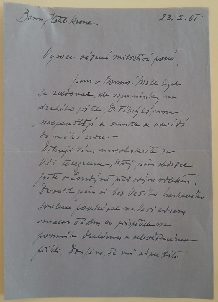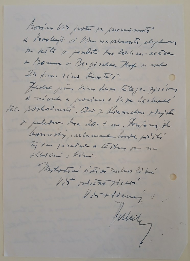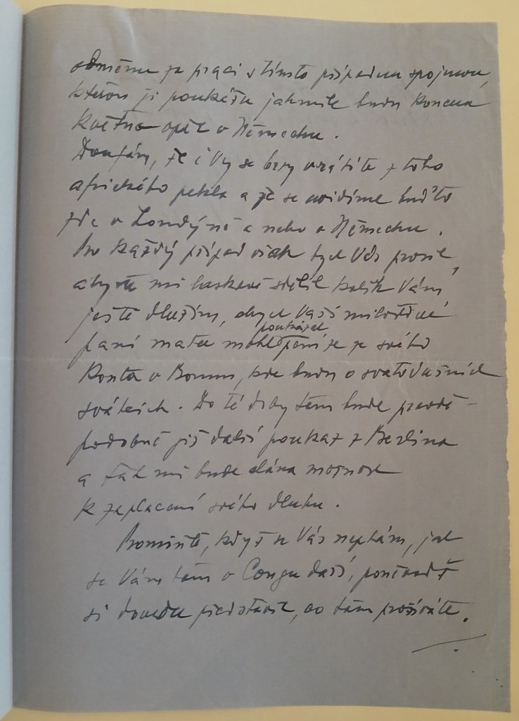A nyní mám k Vám, vzázcný příteli, jednu velikou prosbu. Abych zde měl pevný důkaz pro nutnost své jízdy do Německa, zašlete mně, prosím, telegram, v němž mě vyzýváte k schůzce v Německu. Dejž Bůh, aby taková schůzka se stala doopravdy možnou.