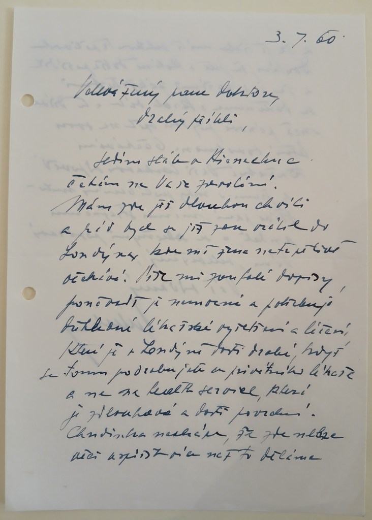 Dr.Höniger obdržel přípis Regierungspräsidenta teprve 8.8.60 a ihned mi jej zaslal. Zařídil jsem okamžitě vše potřebné a včera dne 25.8. jsem již poslal Hönigerovi potvrzení Home Office, že jsem byl Flüchtling (ode) dne 1.10.53 ve smyslu Ženevské konvence z roku 51 a že moje residence je ve Velké Británii. Byl jsem také na zdejším německém velvyslanectví kvůli lékařské prohlídce. Ale tam mi bylo řečeno, že Köln musí znovu o ní požádat a to jsem také sdělil Hönigerovi s prosbou, aby Köln o tom ihned vyrozuměl. Vrátil jsem mu také přípis Regierungspräsidenta, který měl číslo: 14.II.-6-673-674 28.8.60. Napíšu mu ihned, aby Vám tento přípis poslal do Ženevy.