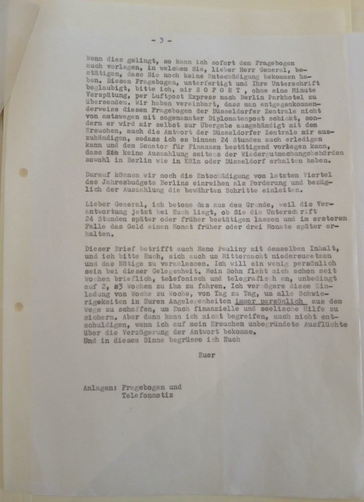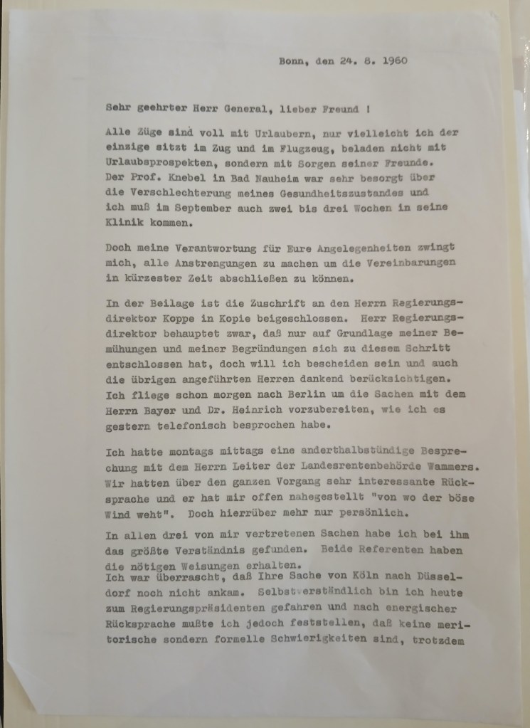 I confirm with thanks your esteemed letter of 23.7.60, replying today, because I was expecting Cologne to respond. Unfortunately, this has not happened yet. In the meantime, I have received a letter from Mr. Minister Seebohm, who informs me that he too was confirmed by the A-Amt that the AA’s opinion was favorable and sent to the Regierungspräsident in Cologne. After receiving this reply from the A-Amt, Minister S. contacted Dr. Mirgeler and asked him to expedite my case. M. promised him this, but pointed out that Cologne would ask me again and ask for confirmation, I quote: “der Staatenhorigkeit, die früher als 1956 vorhanden sein müsste, aber danach mit einer boldigen Entscheidung gerechnet werden könne”. But now I don’t understand it at all. After all, my application for a pension according to § 1 BEG explicitly states who I am and what I am and also that I have been stateless since 1939.