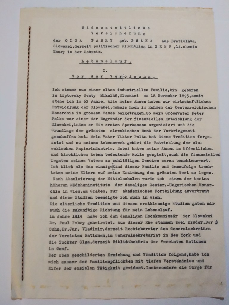 That this statement is being prepared by me at the request of Mrs. Olga Viera Fabry, nee Palka, who formerly resided in Bratislava, Czechoslovakia, but since 1948 has become a political refugee and at present resides at 14, Chemin Thury, Geneva, Switzerland;