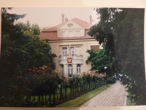 When you search for images of the “Russian Embassy Bratislava”, you see the roses have all been removed now, and there is a new tiered fountain, but if you can ignore the flag of Russia and the gilded emblem of the federation hanging off the balustrade, it still looks like our house!