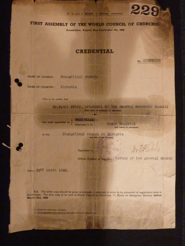“To whom it may concern: This is to certify that Dr. Pavel FABRY, Czechoslovakian, born 14.1.1891[14 January] at Turčiansky Sv Martin, has been appointed as participant in the First General Assembly of the World Council of Churches, to be held in Amsterdam, Holland, from August 22nd to September 4th 1948.
