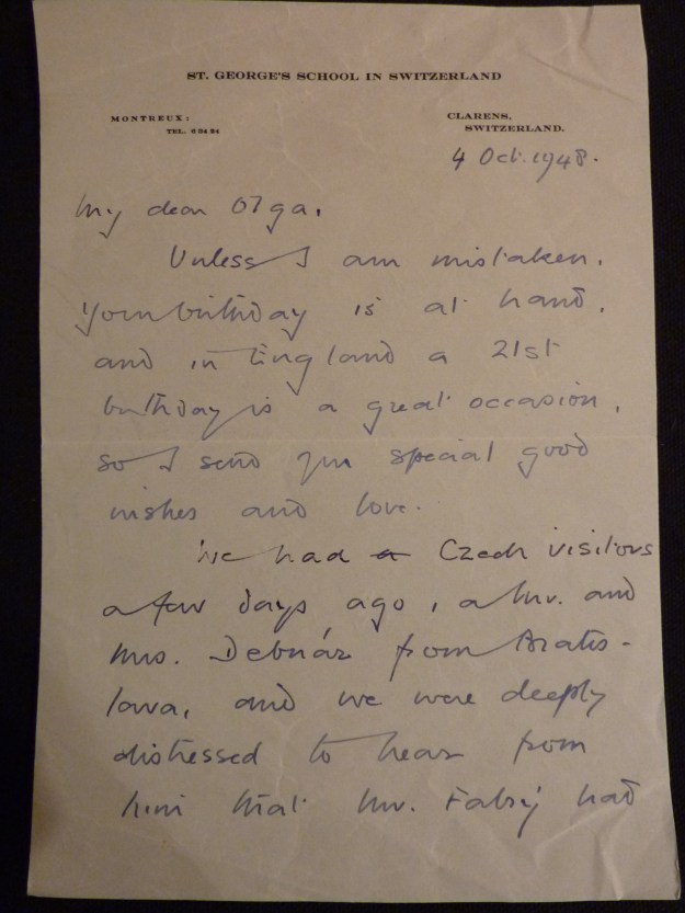 From 4 October 1948, this letter was written to Olinka, who was a student in 1947 at St. George’s School, Clarens, Switzerland: