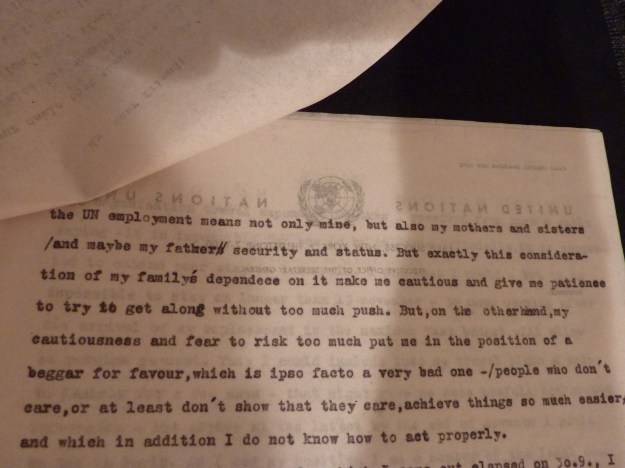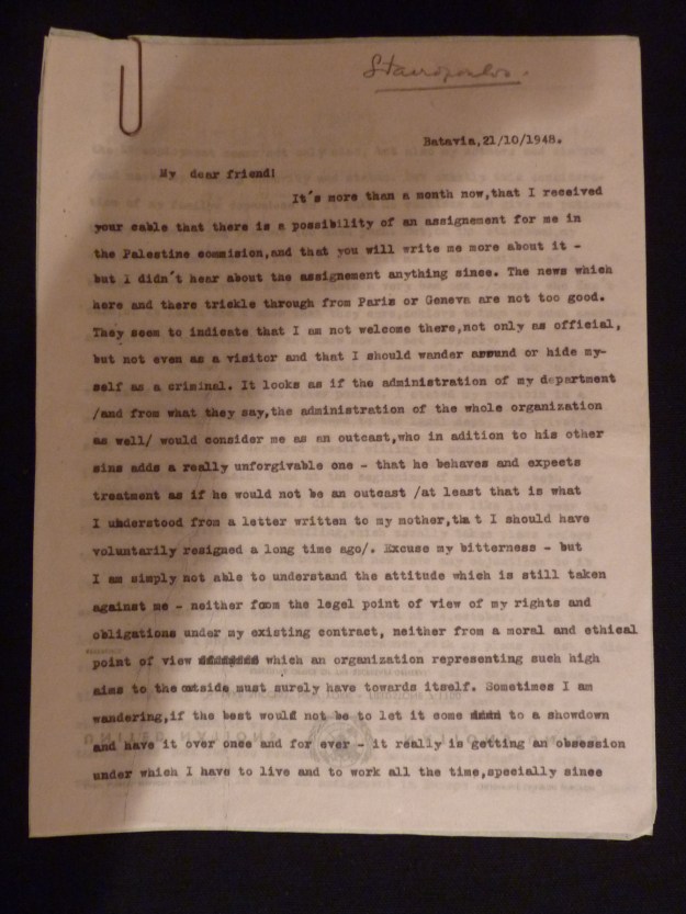 “It’s more than a month now, that I received your cable that there is a possibility of an assigment for me in the Palestine commision, and that you will write me more about it – but I didn’t hear about the assignment anything since. The news which here and there trickle through from Paris or Geneva are not too good. They seem to indicate that I am not welcome there, not only as official, but not even as a visitor and that I should wander around or hide myself as a criminal. It looks as if the administration of my department /and from what they say, the administration of the whole organization as well/ would consider me as an outcast, who in addition to his other sins adds a really unforgivable one – that he behaves and expects treatment as if he would not be an outcast /at least that is what I understood from a letter written to my mother, that I should have voluntarily resigned a long time ago/. Excuse my bitterness – but I am simply not able to understand the attitude which is still taken against me – neither from the legal point of view of my rights and obligations under my existing contract, neither from a moral and ethical point of view which an organization representing such high aims to the outside must surely have towards itself. Sometimes I am [wondering], if the best would not be to let it come to a showdown and have it over once and for ever – it really is getting and obsession under which I have to live and to work all the time, specially since the UN employment means not only mine, but also my mothers and sisters /and maybe my fathers/ security and status. But exactly this consideration of my family’s dependence on it make me cautious and give me patience to try to get along without too much push. But, on the other hand, my cautiousness and fear to risk too much put me in the position of a beggar for favour, which is ipso facto a very bad one -/people who don’t care, or at least don’t show that they care, achieve things so much easier/- and which in addition I do not know how to act properly.[…]”