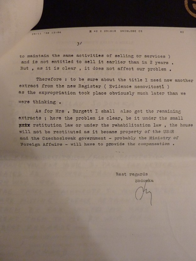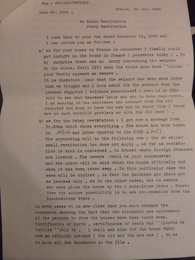 Dr. Kerno’s son, Ivan, who was also a lawyer, would later help Vlado’s sister Olga in 1990, as they were both seeking restitution, and needed someone to investigate the status of their houses in Prague and Bratislava. This fax from Prague is addressed to Mr. Krno, dated 20 November 1990, from lawyer Dr. Jaroslav Sodomka. Dr. Sodomka writes that the Fabry house was “taken in 1951-52[the dates are handwritten over an area that looks whited-out] and later donated to the USSR (1955)[the date and parentheses are also handwritten over a whited-out area].”