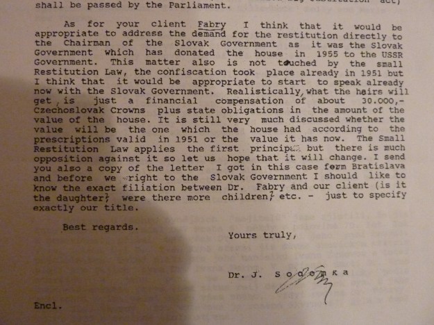 “[…]As for your client Fabry, I think that it would be appropriate to address the demand for the restitution directly to the Chairman of the Slovak Government as it was the Slovak Government which has donated the house in 1955 to the USSR Government. This matter also is not touched by the small Restitution Law, the confiscation took place already in 1951 but I think that it would be appropriate to start to speak already now with the Slovak Government.[…]”