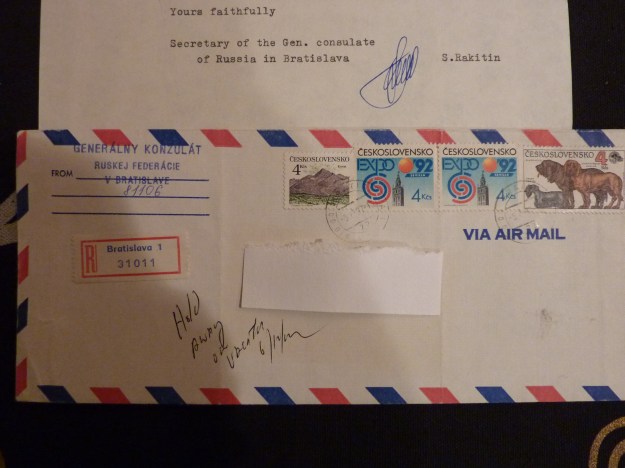 This is an undated letter from the Russian embassy in Bratislava(our house), the postal cancellation is hard to decipher but appears to be from June 5 1992, and there is a written note to “HOLD Away or on Vacation”. This may have arrived while Olga and her husband were already in Czechoslovakia – finding this waiting back home in New York, I can only imagine how she must have felt! This contradicts what Lawyer Sodomka told her, but it confirms Pavel’s testimony: the house was taken in 1948.