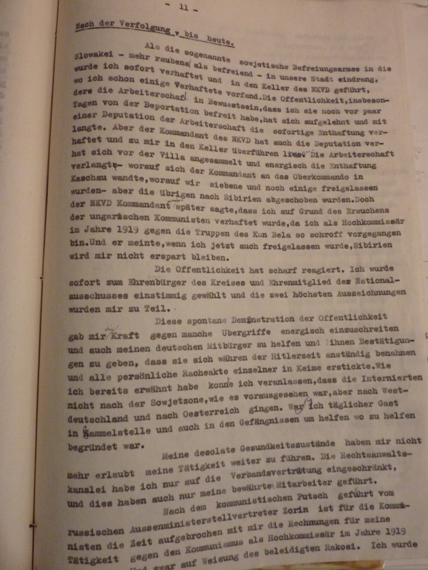 “As the so-called Russian Liberation Army in Slovakia – consuming (raubend) more than liberating – invaded our city, I was immediately arrested and led into the basement of the NKVD, where I found quite a few others arrested. The public, especially the workers in awareness that I freed from deportation a few days before, chose to stand up and with the deputation of workers demanded the immediate release from liability. But the commander of the NKVD also had the deputation arrested and had me lead them into the cellar. The workers union had accumulated in front of the Villa and vigorously demanded the release from liability, whereupon the commander turned to the High command in Kosice, whereupon we were released – seven and a few, but the rest were to be deported to Siberia. The NKVD commander later said I was arrested on the basis of the request of the Hungarian Communists, because I, as High Commissioner in 1919, acted so harshly (so schroff) against the troops of Bela Kun. And he said that if I was released now, I would not be spared Siberia.