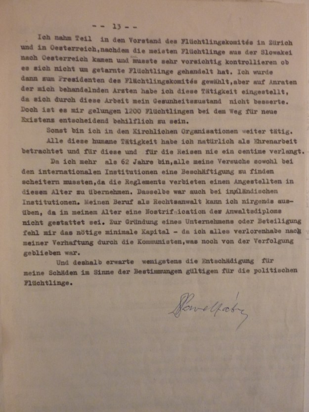 I took part on the board of the Refugee Committee in Zurich and Austria, after most refugees came from Slovakia to Austria, and I had to check very carefully if there were any refugees that had been disguised. I was then elected as President of the Refugee Committee, but on the advice of the doctors treating me I had to adjust this activity, because through this work my health did not improve. Nevertheless, I succeeded in helping assist 1200 refugees in the decisive path of new existence.