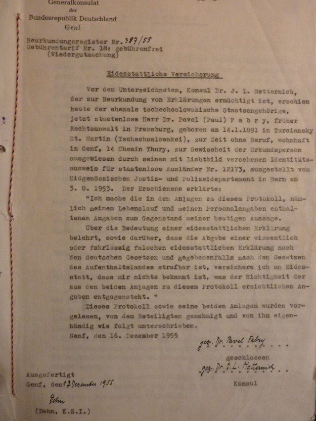 The C.V. of Pavel Fabry from 17 December 1955, which I translated a while back; the letterhead on this first page is from the Consulate General of the Federal Republic of Germany, Geneva.