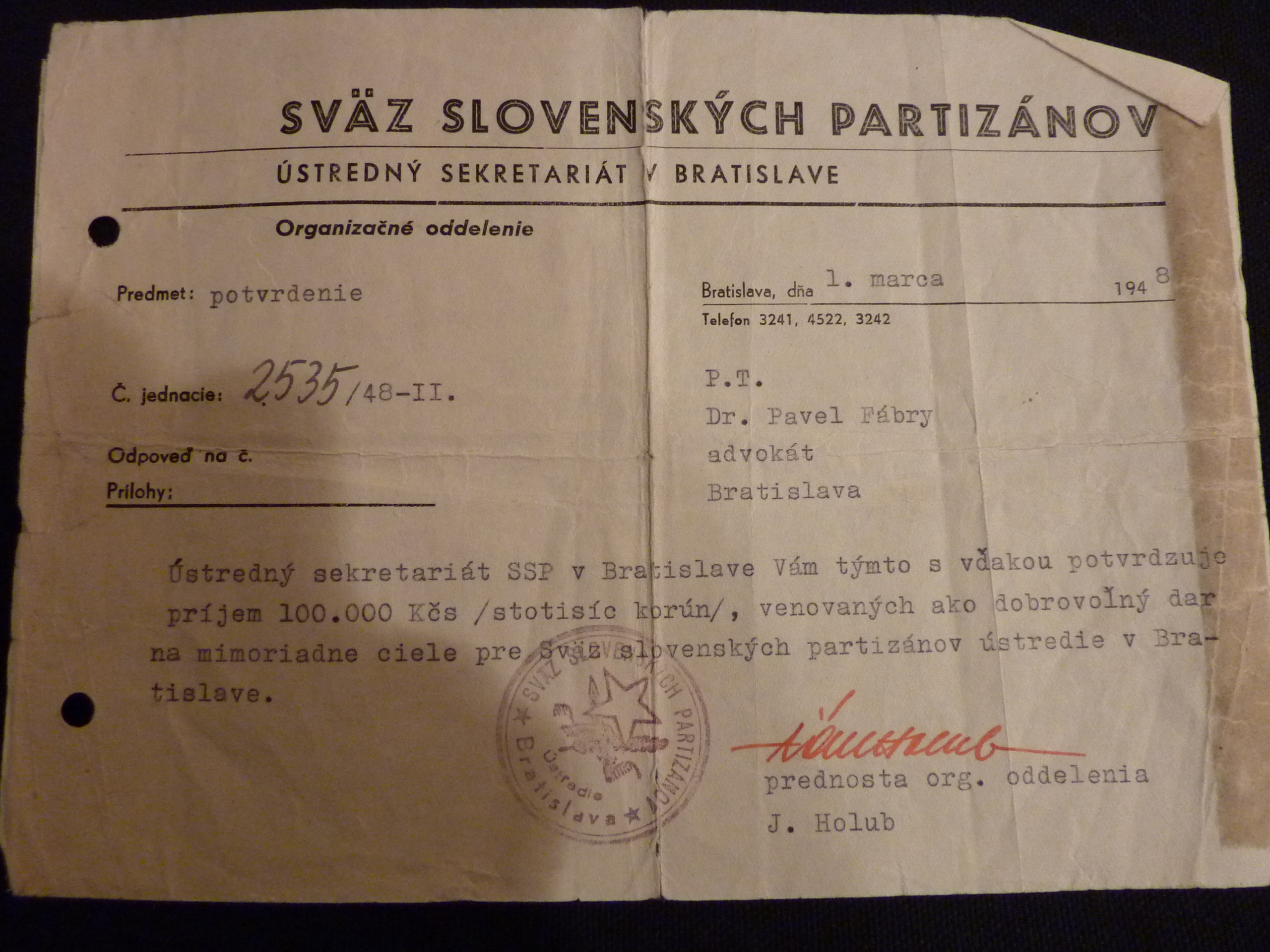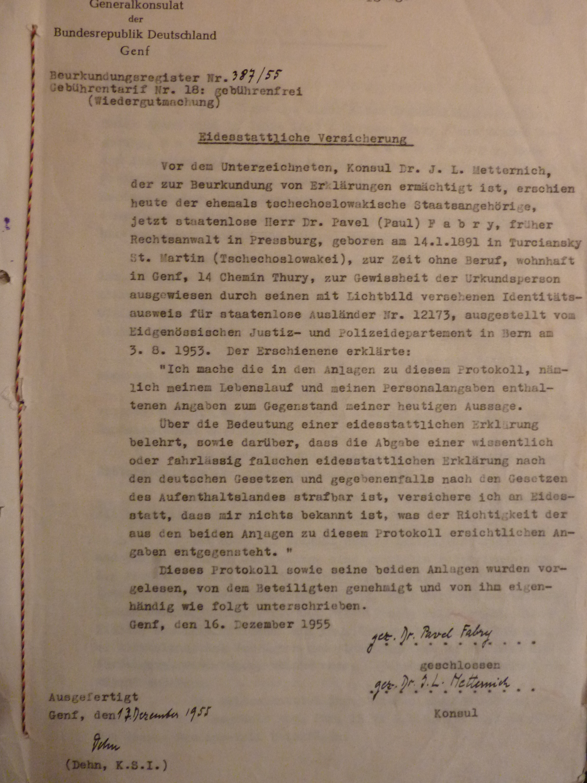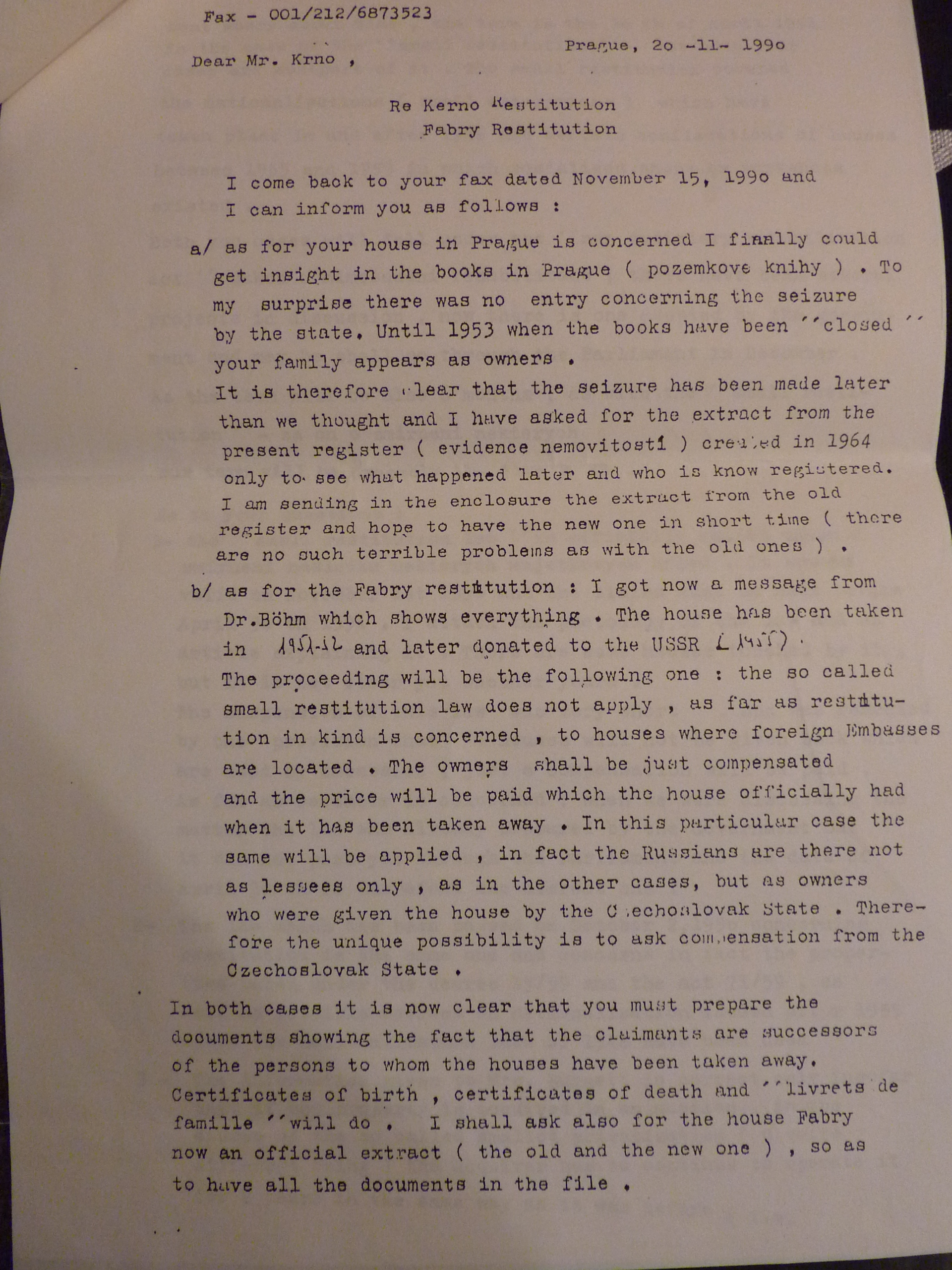 promiňte, když na Váš milý dopis ze 7. t.m. odpovídám teprve dnes, ale byl jsem v Německu a vrátil jsem se teprve koncem minulého týdne. Byl jsem v Bonnu, ve Stuttgartu a Mnichově a všude mě doprovázely vzpomínky na milovaného přítele Dr. Fábryho, jenž padl ve službě pro své blízké. Jen jeho genialitě a krajní obětavosti máme co děkovat, že byly dosažena výsledky, o nichž se nikomu z nás, jeho klientů, ani nesnilo. Ale co pak znamenají všechny poklady tohoto světa, které vždy možno nahradit, oproti ztrátě milovaného manžela, otce a přítele?