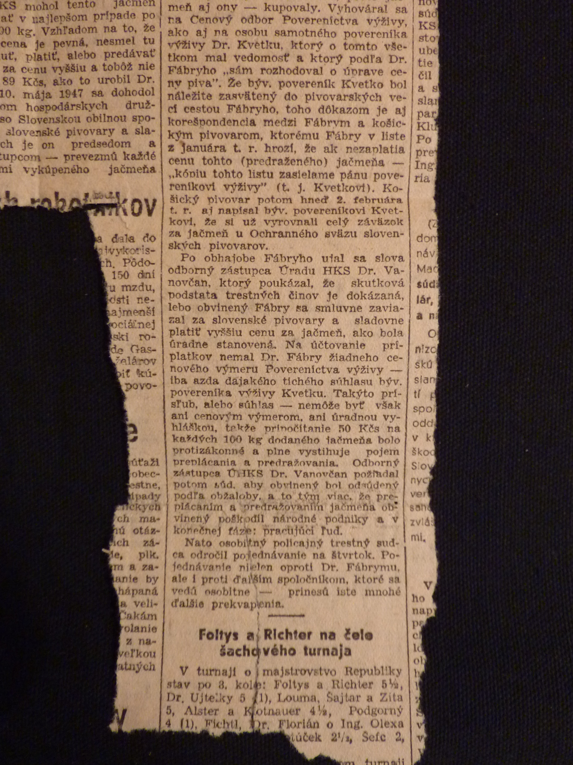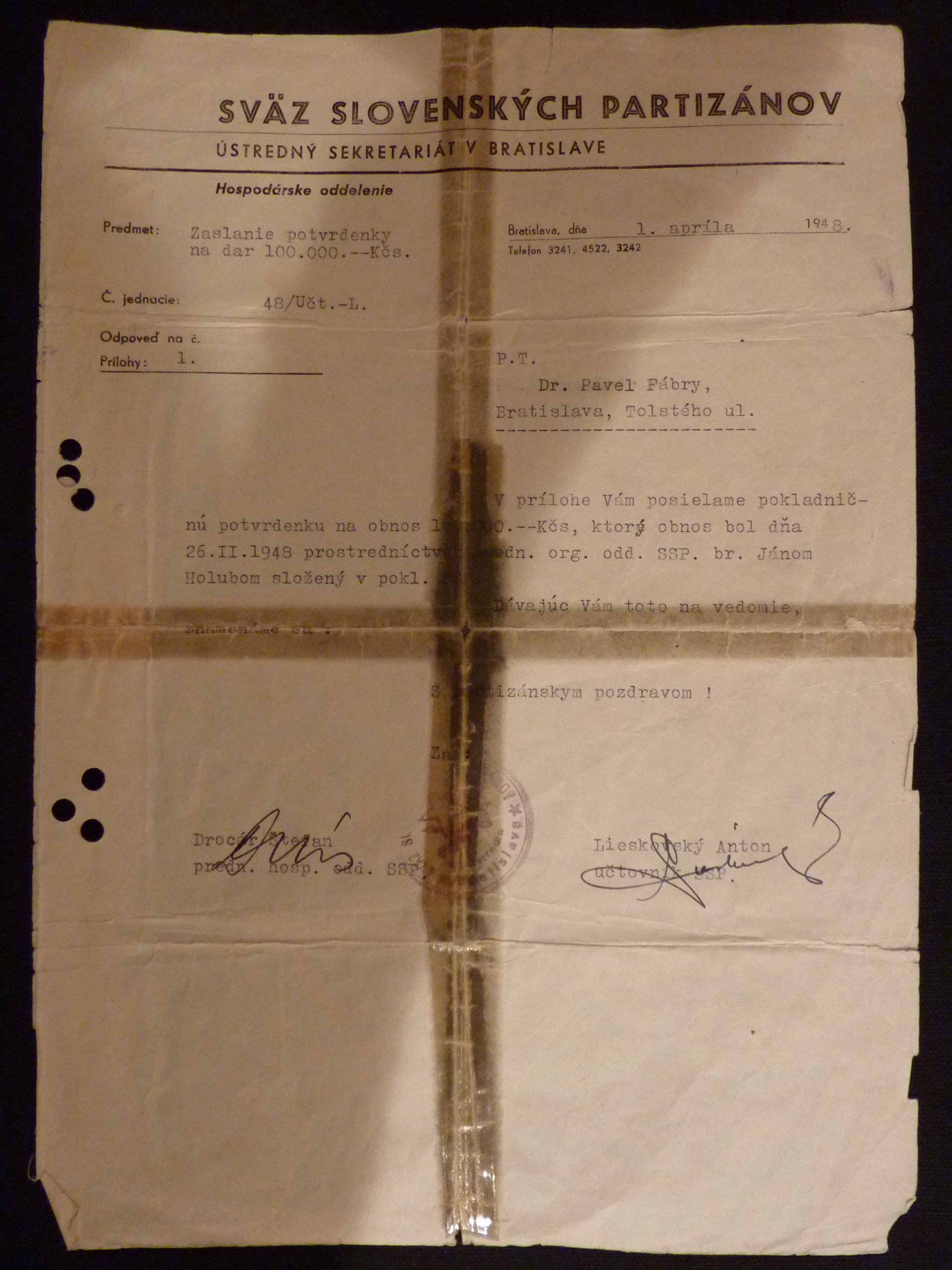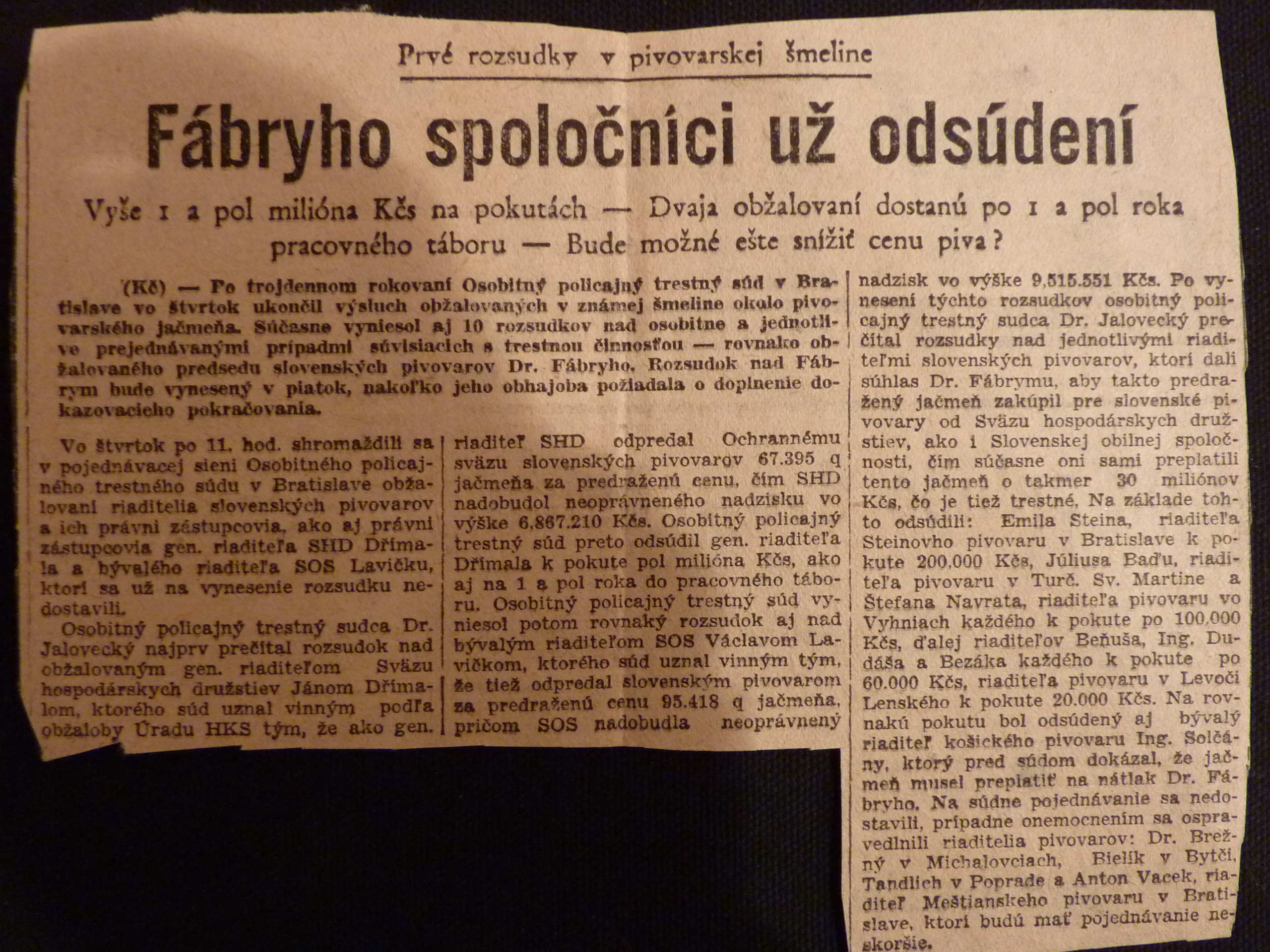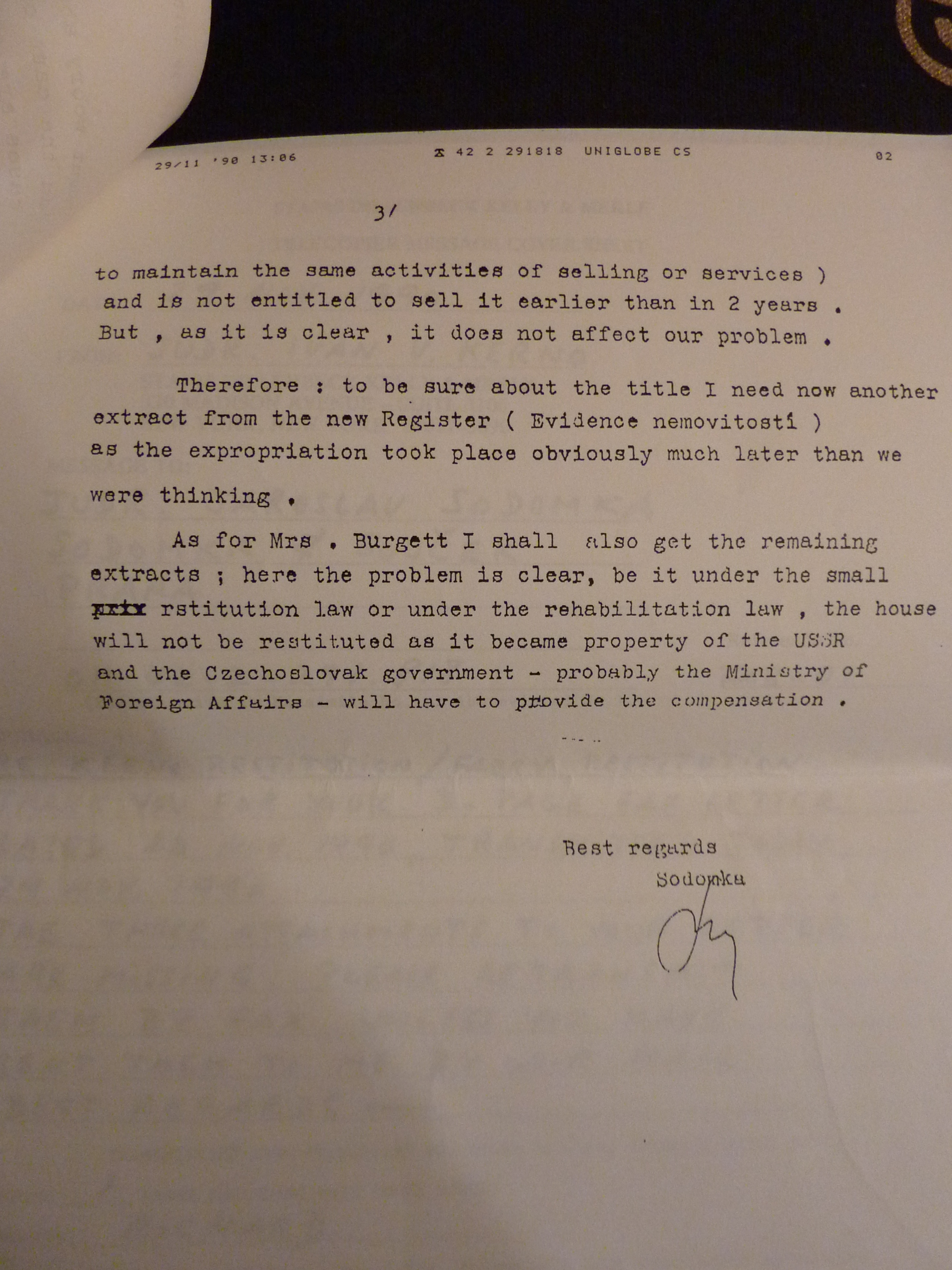 promiňte, když na Váš milý dopis ze 7. t.m. odpovídám teprve dnes, ale byl jsem v Německu a vrátil jsem se teprve koncem minulého týdne. Byl jsem v Bonnu, ve Stuttgartu a Mnichově a všude mě doprovázely vzpomínky na milovaného přítele Dr. Fábryho, jenž padl ve službě pro své blízké. Jen jeho genialitě a krajní obětavosti máme co děkovat, že byly dosažena výsledky, o nichž se nikomu z nás, jeho klientů, ani nesnilo. Ale co pak znamenají všechny poklady tohoto světa, které vždy možno nahradit, oproti ztrátě milovaného manžela, otce a přítele?