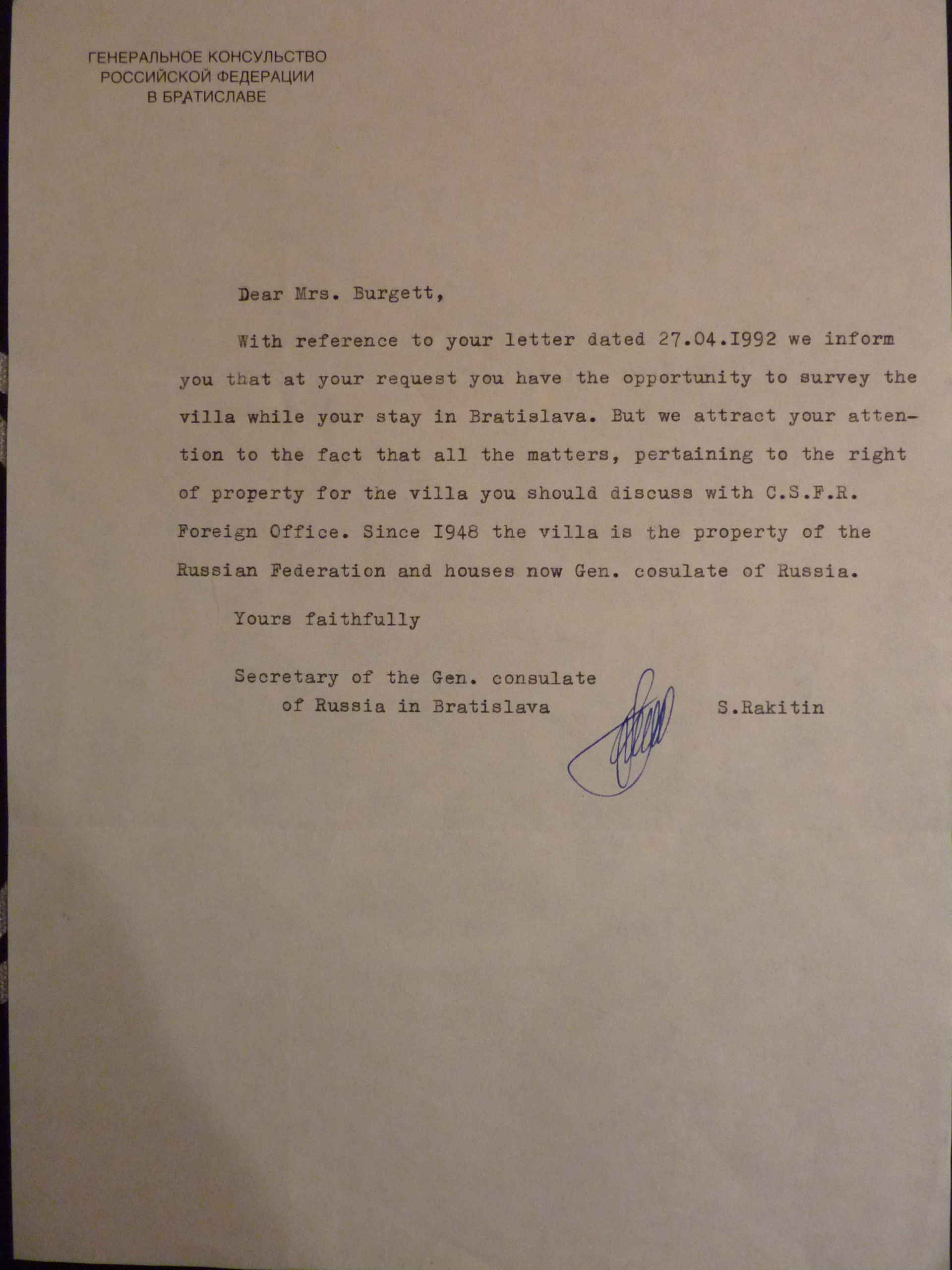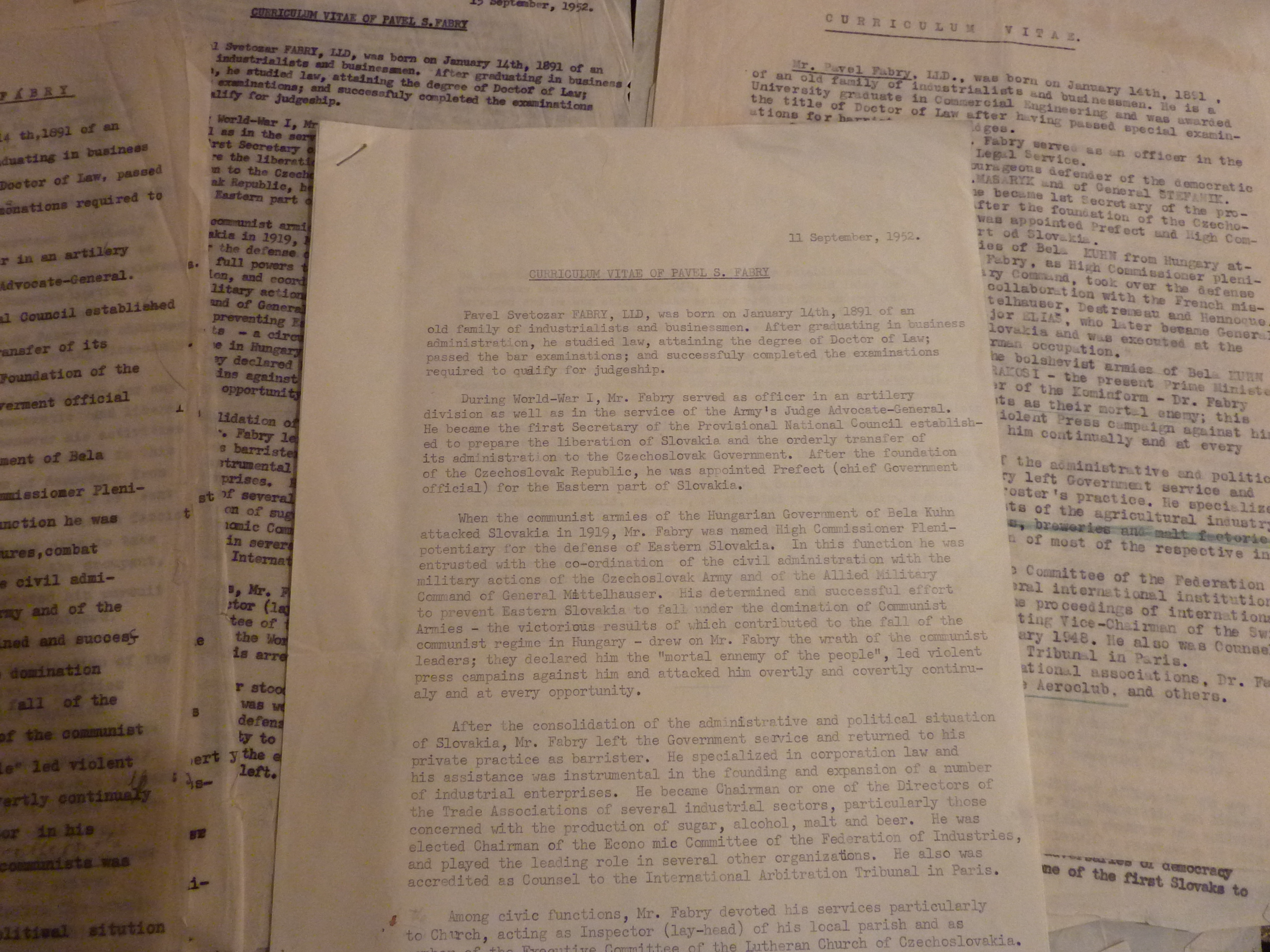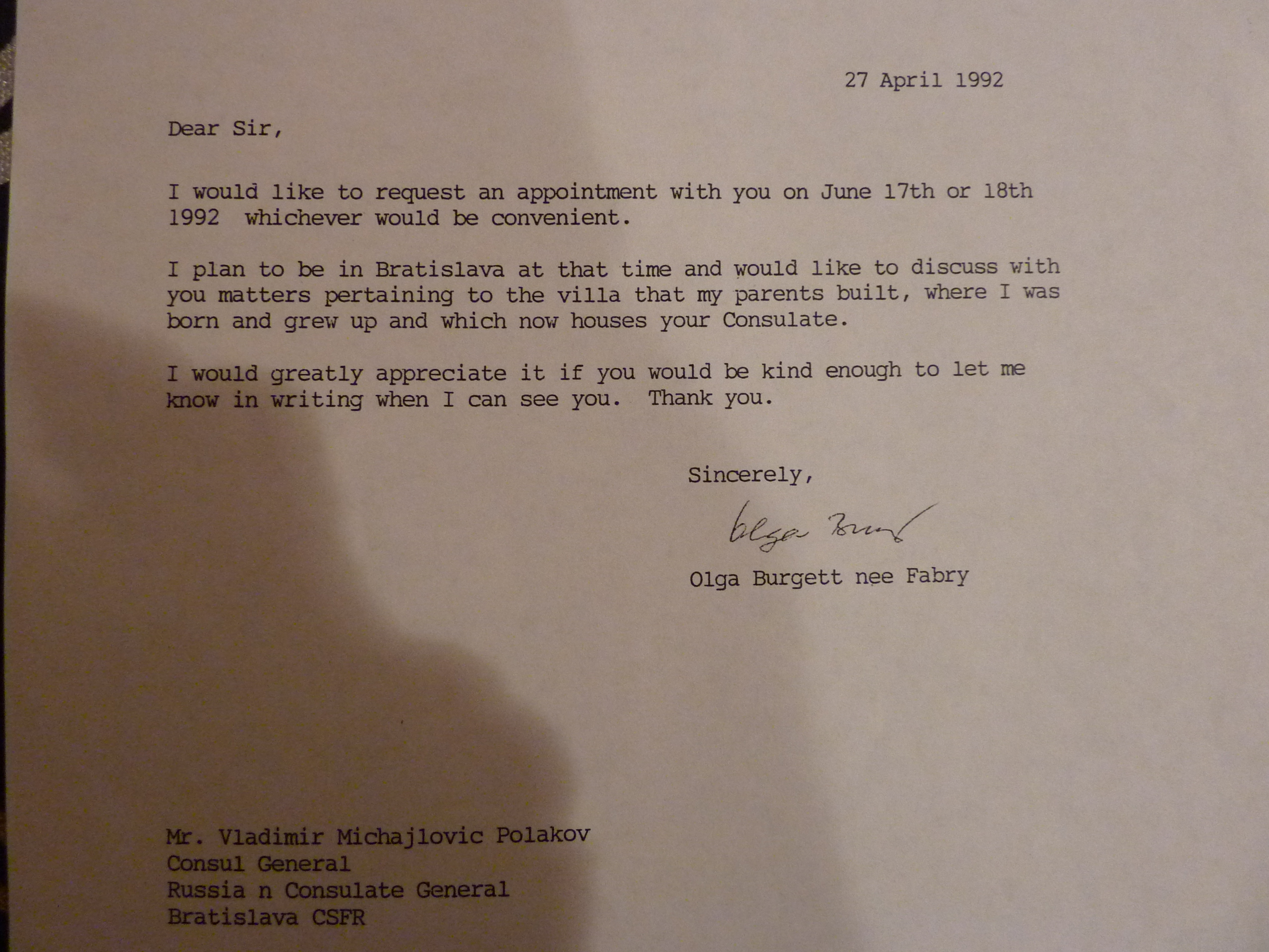 When my Slovak mother-in-law passed away, she left behind a trove of family documents dating back before the creation of Czechoslovakia in 1918. This blog is where I piece together the clues of her family – the Fabry family: Vlado, her only brother – member of the United Nations from 1946 until 1961, when he died in a plane crash on a peace mission with U.N. Secretary General Dag Hammarskjold; Pavel, her father – a lawyer, politician, and son of wealthy industrialists, and one of the first to be imprisoned and tortured in the concentration camp llava, in Czechoslovakia; Olga, her mother – daughter of land-owning aristocrats, who watched as her home was seized from her, and eventually turned into the Russian Consulate, in Bratislava, where it remains today still. My mother-in-law, whose name is also Olga, never gave up trying to get back her home – she even put it in the will, she was adamant that it be returned to the family.