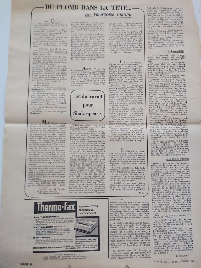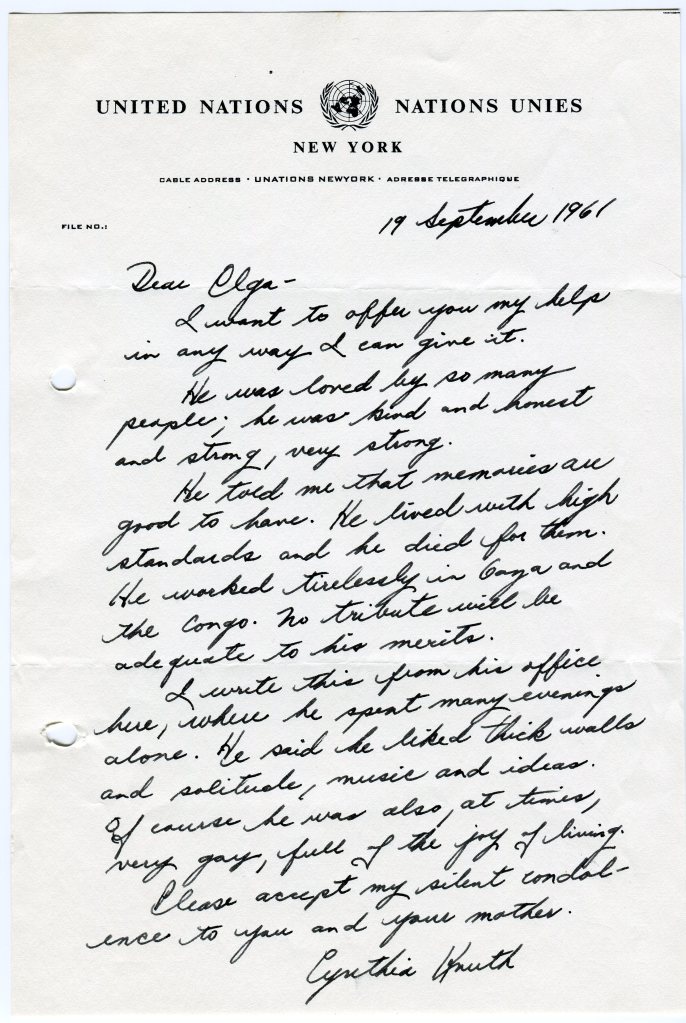 The enclosed are letters [I have not located these letters yet.-T] I received from time to time from Vlado. At the last minute I saved them from the consignment that we have sent down here. The photographs you asked for were packed before that but I shall get them out together with others I might have when our belongings arrive in about 3 weeks.The news photograph [have not located this photo yet.-T] I was able to get by calling up the Daily Express just before I left. They were reluctant to let me have it as it is not only the last one of Vlado but also of Hammerskjold. They said it was for your own personal use. I asked if they had any other in which Vlado might have appeared but they said not.
