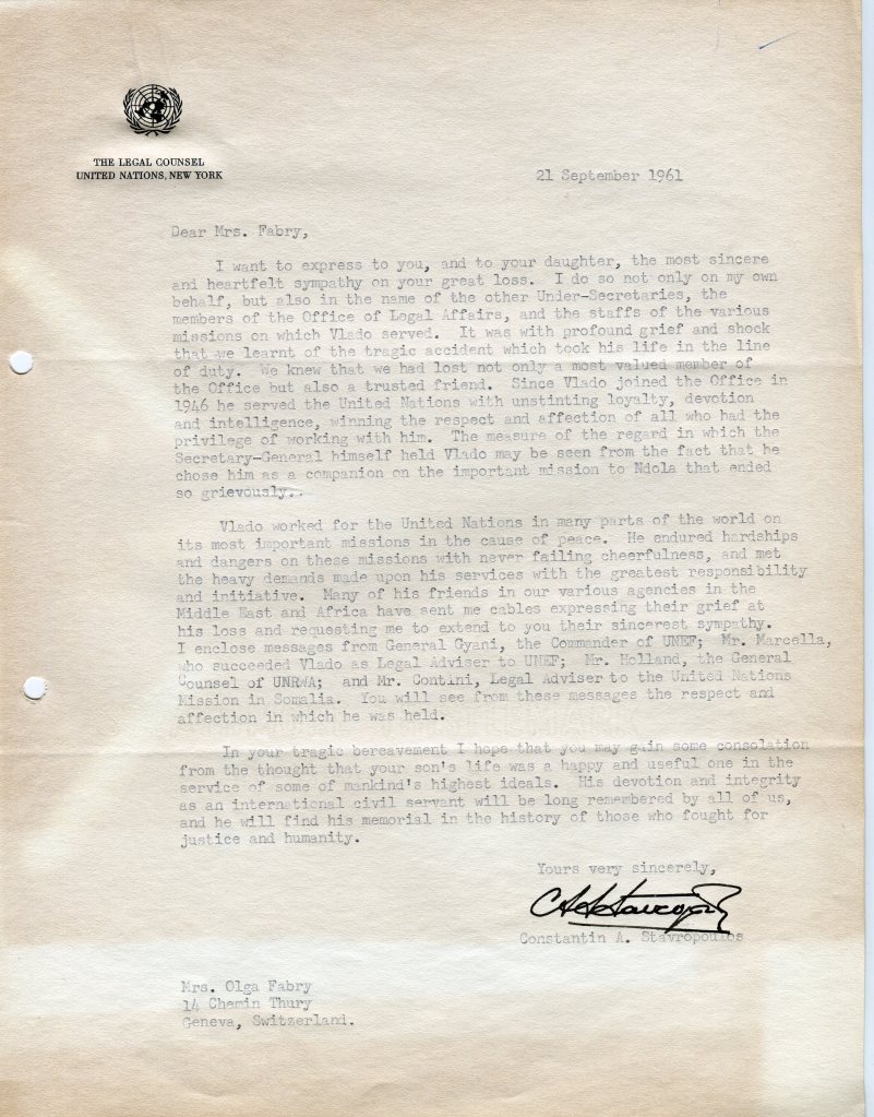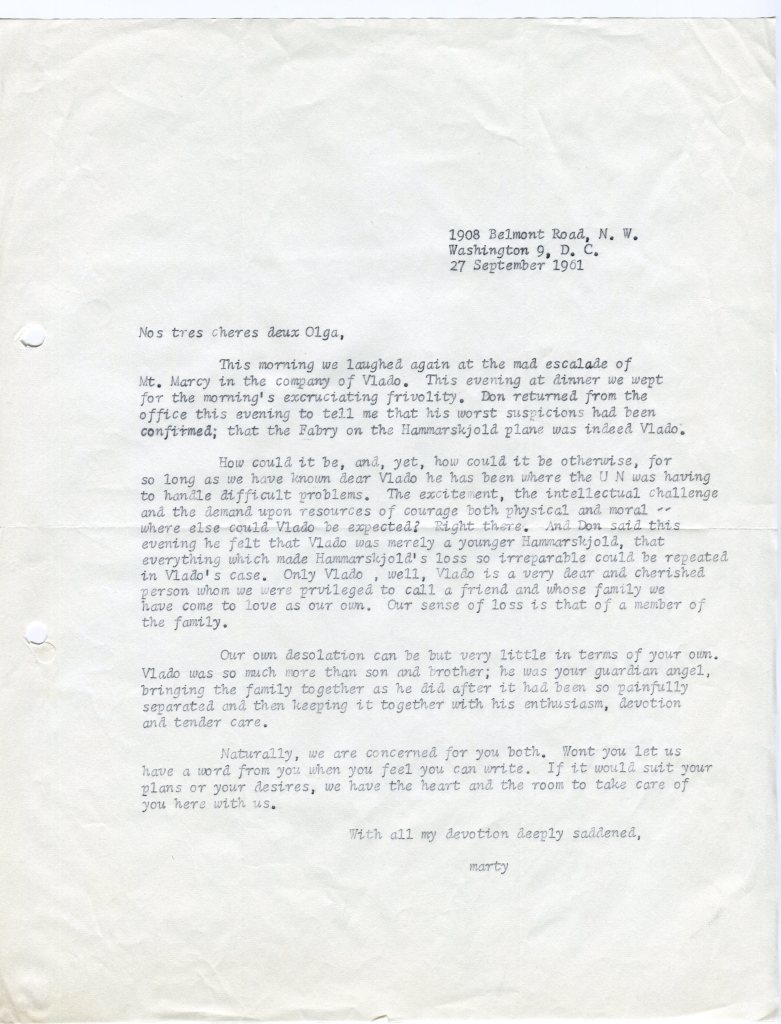 I was deeply shocked and saddened to learn of Vlado’s tragic loss. There are no words to express if fully, but I want you to understand that I am truly sorry, and pray that God is helping you to bear this heaviest of burdens.I did not know Vlado very well, but I think we were friends. We met, of course, through Olga in Geneva, where I studied in 1950-51. Vlado took me skiing in Vermont the following year, one weekend, and I remember how patient he was with my slowness as a somewhat permanent beginner! Then, he and Olga came to Washington, about two or three years ago, and came to see me in Virginia where I was then living. At that time, Vlado was already moving up rapidly at the United Nations. You must indeed be very proud of him for having achieved so much in a short time, and in spite of difficulties which would have discouraged most men. The account of his accomplishments portrays a life of dedication to high principles and of tireless efforts to put them into practice. The United States is the richer for having claimed him as a citizen, and the poorer for having lost him in the battle which we are all fighting. But his spirit and his example will be with us always.