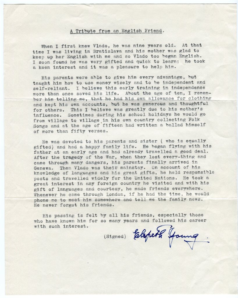 He was devoted to his parents and sister (who is equally gifted) and had a happy life. He began flying with his father at an early age and had already travelled a good deal. After the tragedy of the War, when they lost every-thing and came though many dangers, his parents finally arrived in Geneva. Then Vlado was their mainstay. On account of his knowledge of languages and his great gifts, he held responsible posts and travelled widely for the United Nations. He took a great interest in any foreign country he visited and with his gift of languages and courtesy, he made friends everywhere. Whenever he came through London, if he had the time, he would phone me to meet him somewhere and tell me the family news. He never forgot his friends.