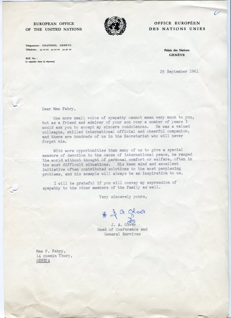 In this photo, Madame Fabry-Palka is consoled by a UN staff member as Olga Fabry (Vlado’s only sibling) stands nearby. I wish I knew who the other people in the photograph were – especially the man with the reflective glasses and the baton at the foot of the stairs.