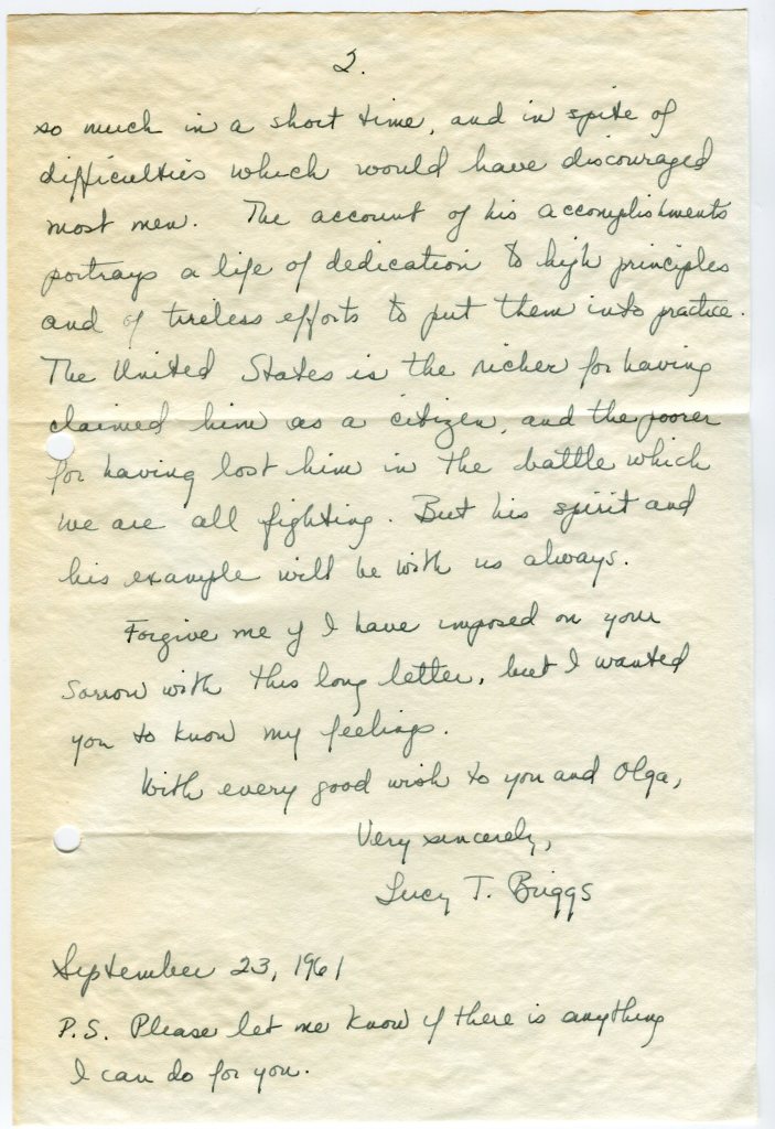 In previous posts (here and here), I learned that Lucy T. Briggs gave the gift of “Bambi” to Vlado, and that she followed in the footsteps of her father, Career Ambassador Ellis O. Briggs, as a Foreign Service Officer. I wasn’t quite sure how they met, until I found this condolence letter recently, written to Mrs. Fabry, dated September 23, 1961: