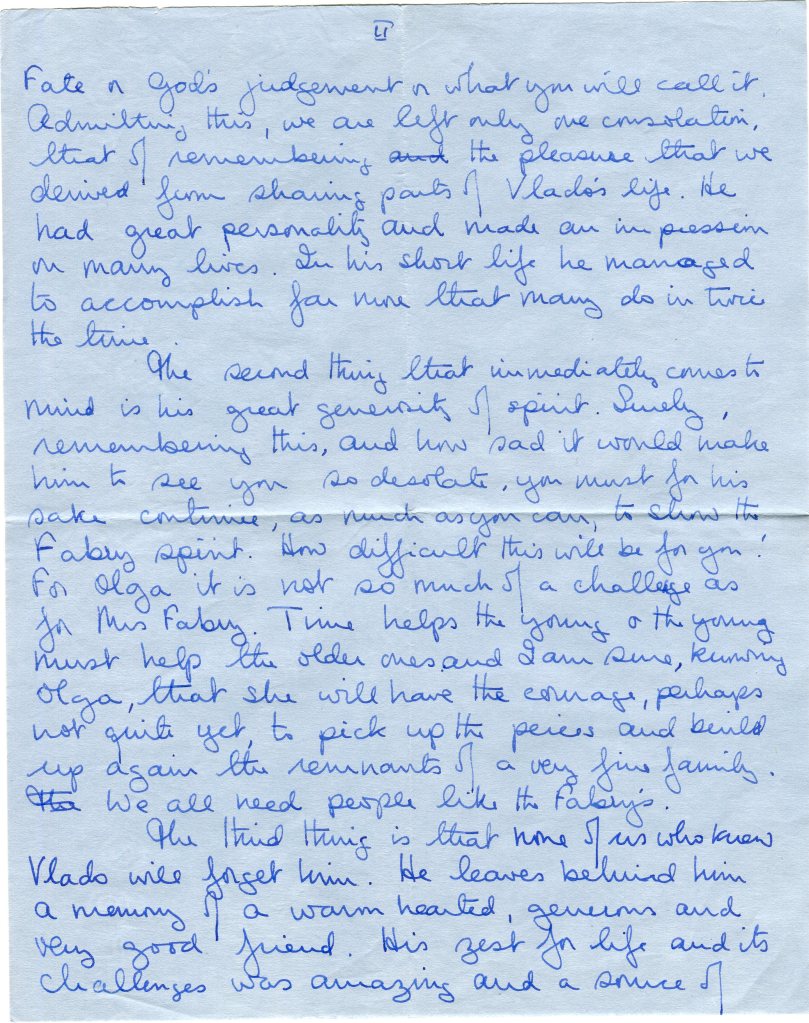 The first thing is that you of all people should have been spared this tragedy and Vlado was a man that the world and his friends needed. However, I have long ago found out and I’m sure you did before me, that it is useless to question Fate or God’s judgement or what you will call it. Admitting this, we are left only one consolation, that of remembering the pleasure that we derived from sharing part of Vlado’s life. He had great personality and made an impression on many lives. In his short life he managed to accomplish far more that many do in twice the time.
